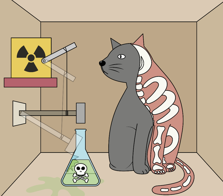 This indeterminism drove Schrö-Schrö and Einstein insane for a couple of reasons. Schrö-Schrö expressed his frustration with the theory by creating a thought experiment in his letter where a cat was in a box with a flask of poison and a radioactive source.